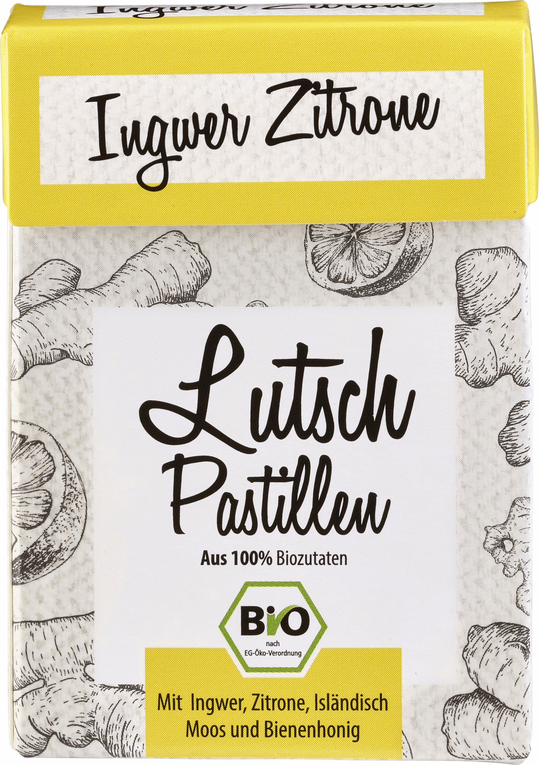 Ingrediente: guma arabica*, zahar*, sirop de glucoza*, miere*, extract de muschi islandez*, ulei de ghimbir*, suc de lamaie concentrat*, ceara carnauba*.